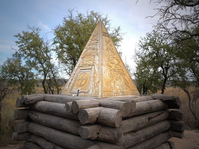 En ese monumento que vemos en portada están los restos de Mariano Rosas, un cacique ranquel. La forma de pirámide significa el viaje “desde el ombligo de la tierra hacia la luz”.
