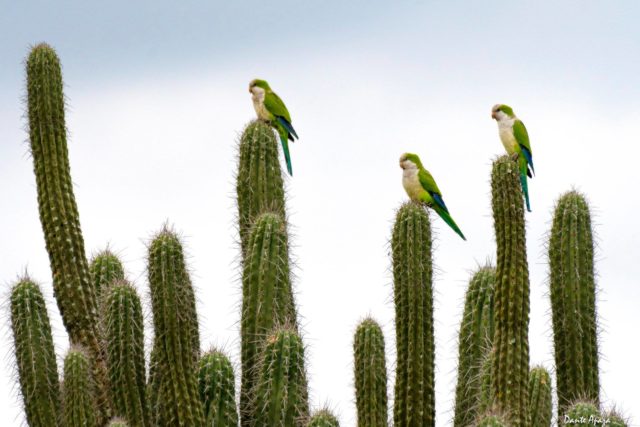 Lo que vemos son cactus de gran altura y un par de loros que descansan en ellos con mucho cuidado y tranquilidad. El verde de la fauna y flora contrasta a la perfección con el celeste del cielo.